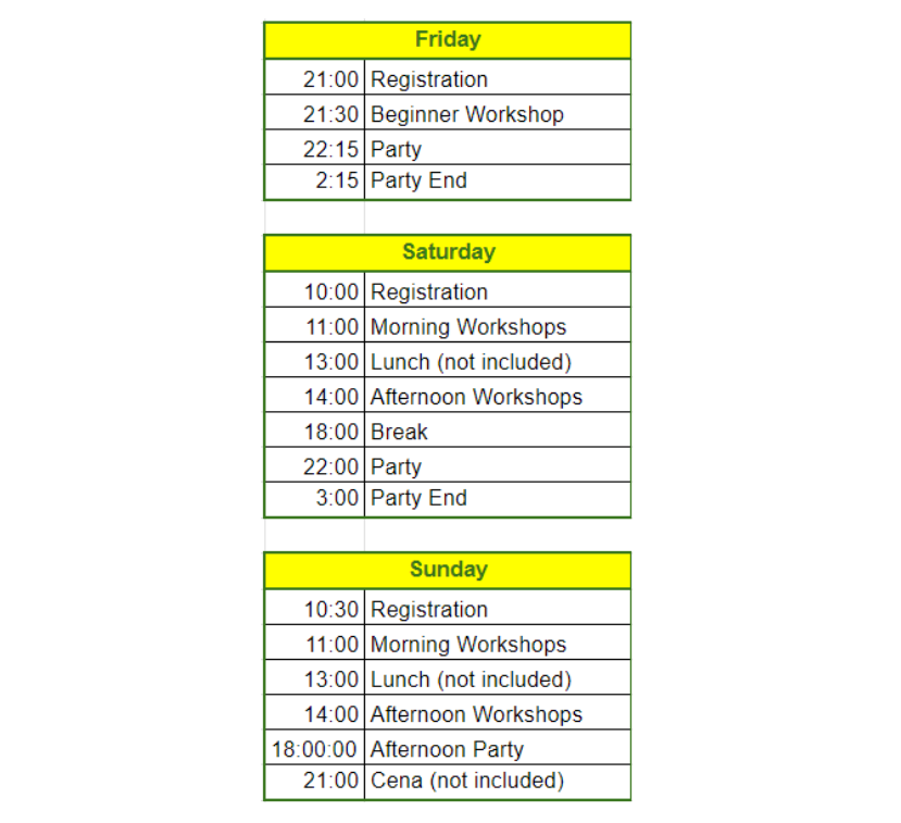 - ✔ Workshops Saturday and sunday