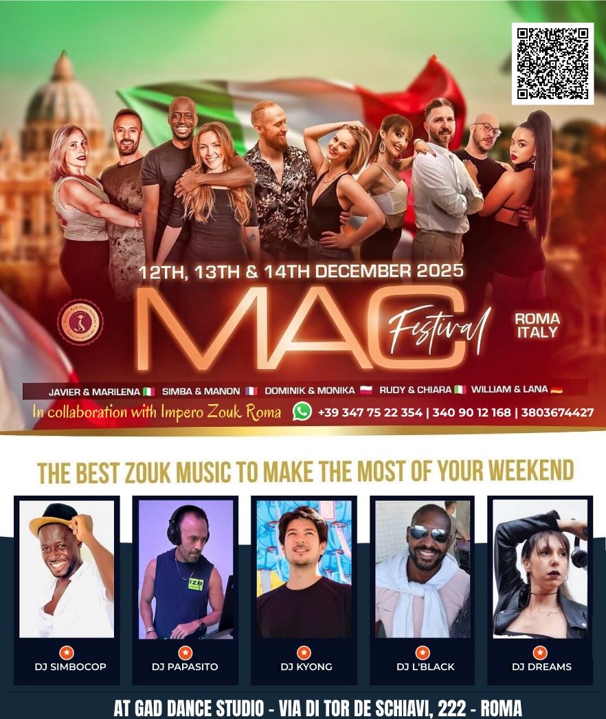 From 12 to 14 December 2025 everyone in Rome (Italy) to participate in the only Italian festival 100% Brazilian Zouk!!!! At G.A.D. Dance Studio (Via di Tor de Schiavi 222, Rome, Italy)!!!!